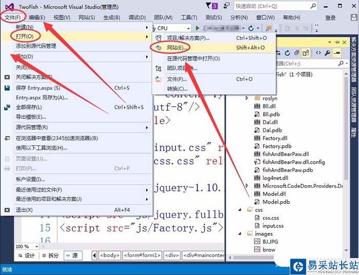 1、在Visual Studio窗口中,選擇文件---->打開---->網站,打開一個已有的網站,本例為TwoFish。