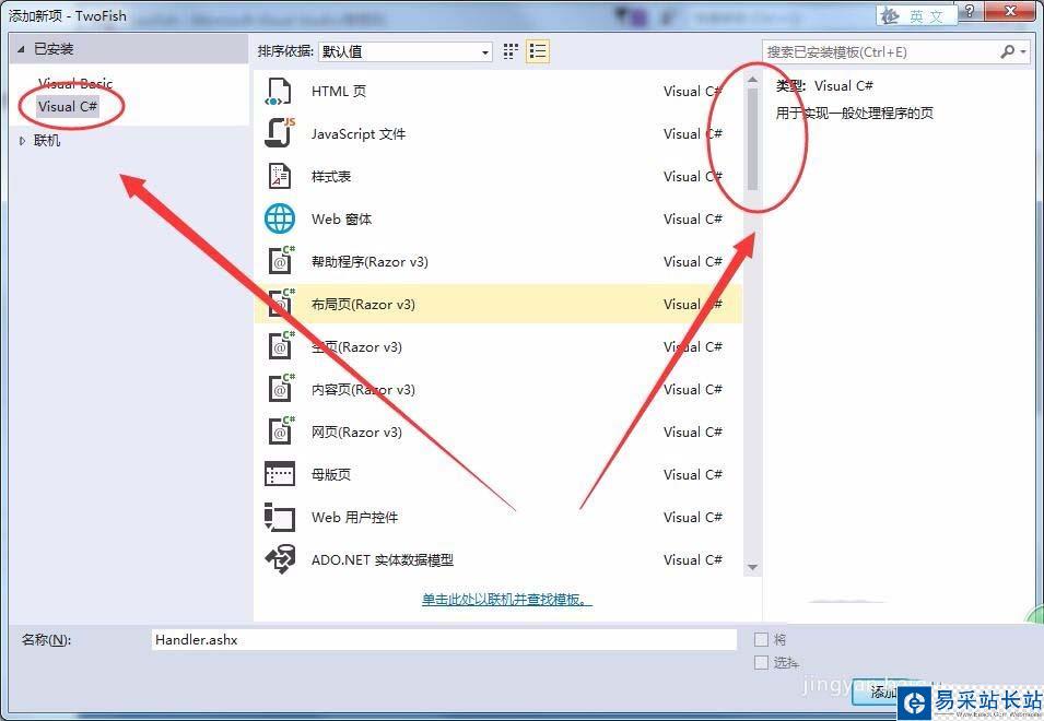 4、添加新項窗口中,左側選擇Visual C#,向下拖動右側的滾動條。