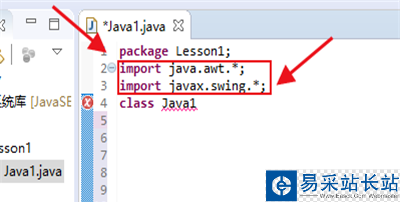 3、第三然后在class類的上面打入兩行代碼。分別是imports java.awt.*和imports javax.swing.*。