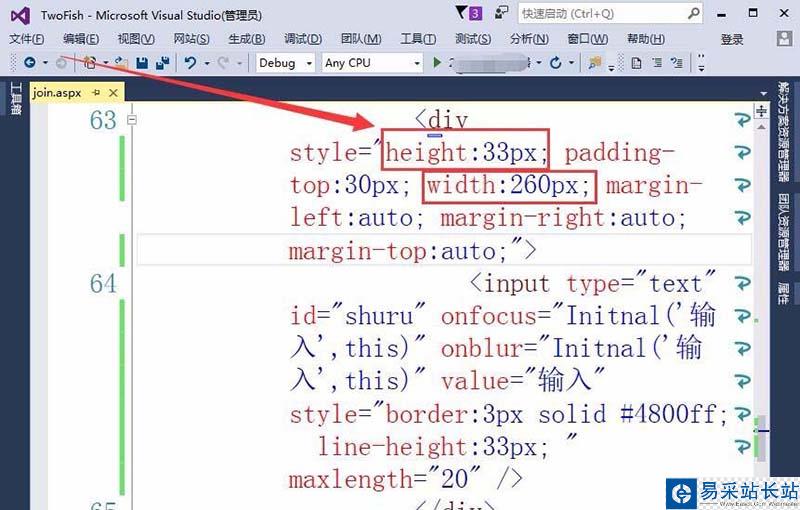3、設置輸入文本框的高度為33像素,寬度為260像素。