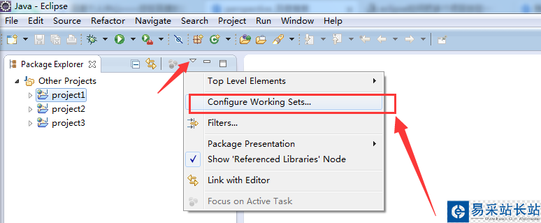 5、如果想建立文件夾可以點擊倒三角,點擊Configure Working Sets,