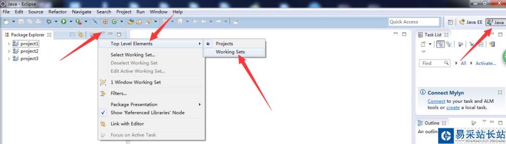 3、點擊倒三角后,下拉菜單中點擊Top Level Elements--->Working Sets,