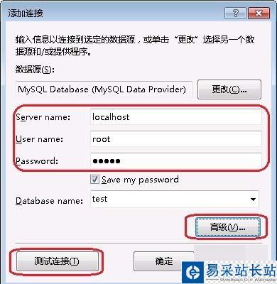 4、在彈出的方框里輸入服務(wù)器名字(默認(rèn)為localhost)、用戶名、密碼和數(shù)據(jù)集的名字等,點(diǎn)擊測(cè)試連接,若沒有報(bào)錯(cuò),則連接成功,點(diǎn)擊【確定】即可。若報(bào)錯(cuò)的話查看一下自己的設(shè)置是否有問題。