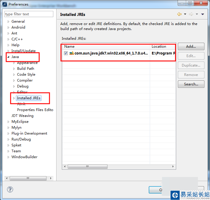 5、在左側找到java 下的InstalledJREs選項 可以看到右側的是MyEclipse的自帶的默認JDK