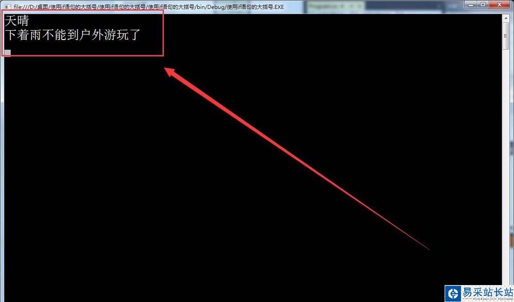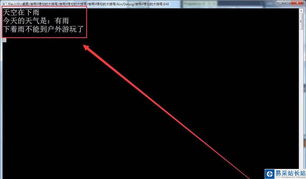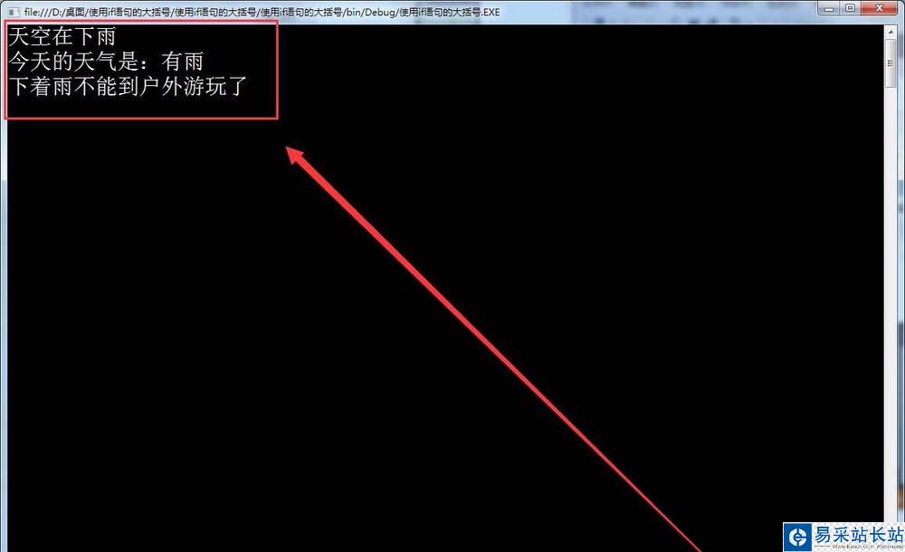 5、如果條件成立,在窗口中輸出,今天的天氣是:有雨,如下圖所示。