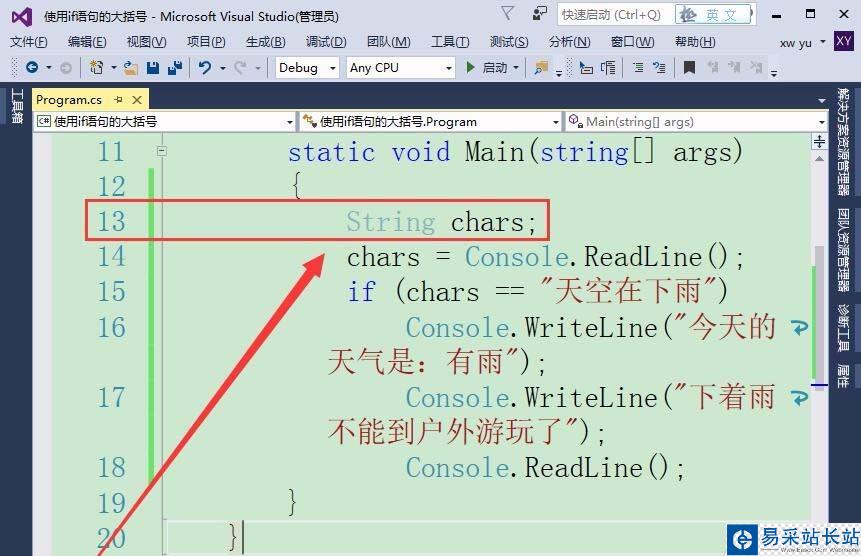 2、編寫一個if語句代碼,如果條件成立執(zhí)行后面的兩個語句,條件不成立則不執(zhí)行這兩條語句。首先,定義一個字符串變量chars。