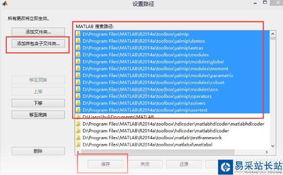 彈出對話框后,在左邊選擇“添加并包含子文件夾...”,(Add with subfolders...),選擇toolbox目錄下的yalmip文件夾,保存并關閉。