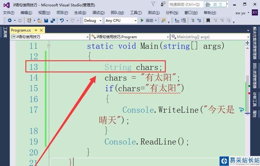 2、首先,在Visual Studio中,定義一個字符串變量chars。