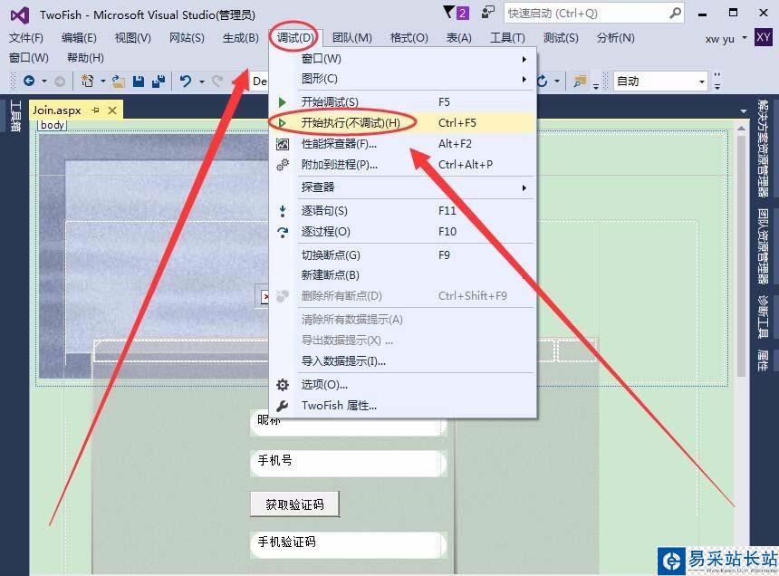 方法二:?jiǎn)螕粽{(diào)試菜單,選擇開始執(zhí)行(不調(diào)試)選項(xiàng)。