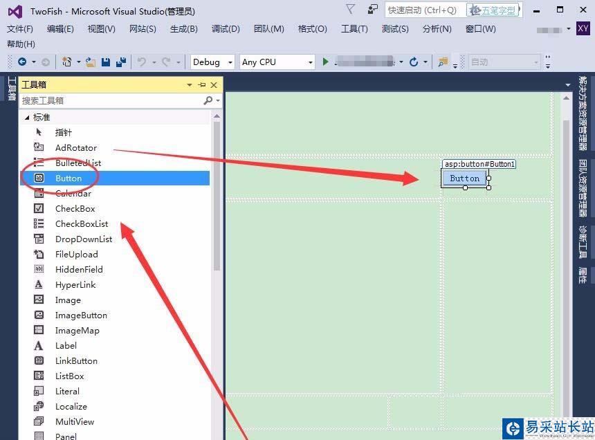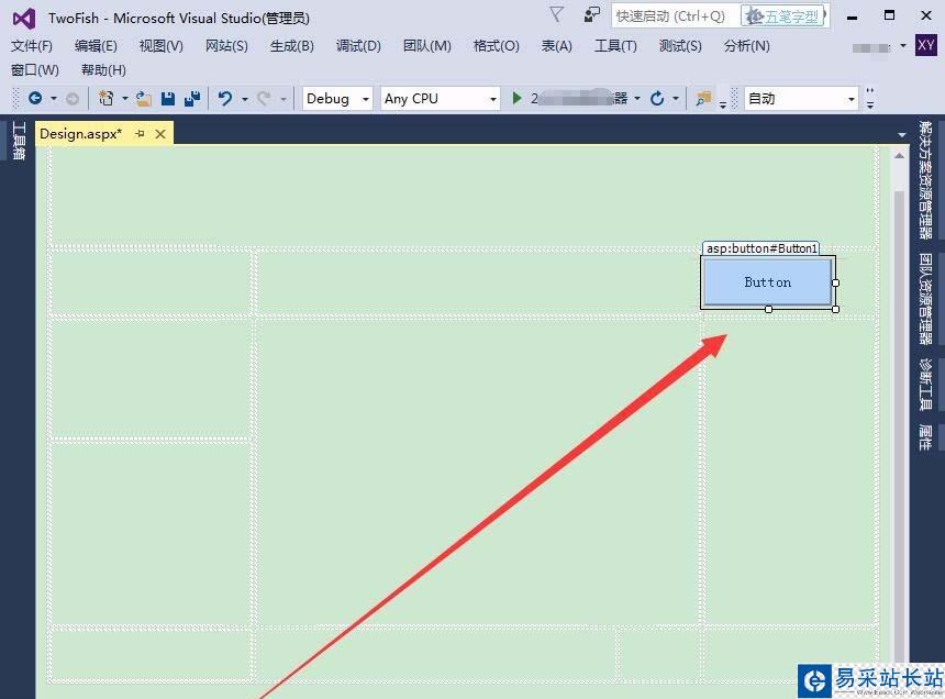 3、工具箱中,選擇Button控件,在網頁中插入該控件。
