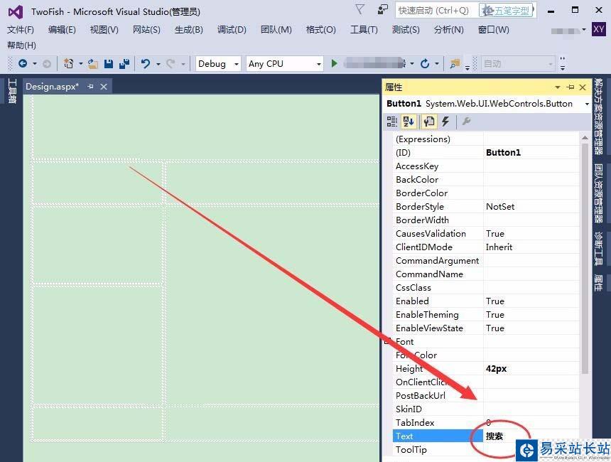 6、屬性窗口中,Text選項處,可以更改按鈕控鍵的顯示文本,本例改為搜索。