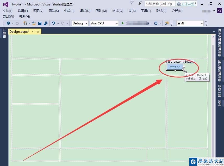 4、選中按鈕控件,將鼠標放置到它四周的控點上,拖動可以改變控件的大小。