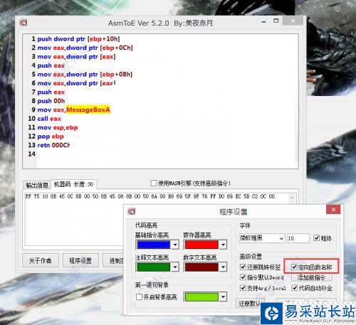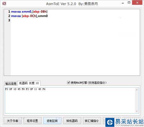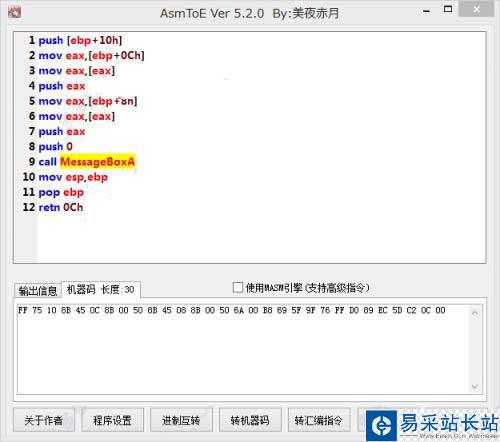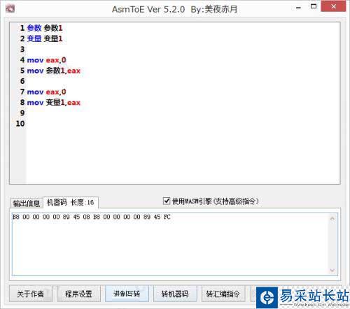 AsmToE是由網(wǎng)友:美夜赤月采用易語言自主編寫的一款綠色免費,功能實用的匯編轉(zhuǎn)換器。它能夠幫助用戶快速進行錯誤代碼檢測,支持匯編功能,進制互轉(zhuǎn)、轉(zhuǎn)機器碼、轉(zhuǎn)匯編指令、查看指令表等功能,支持代碼高亮,用戶可以自定義高亮文本,有切行背景顏色、增加算法、增加字節(jié)集轉(zhuǎn)Masm格式匯編指令,支持高級匯編指令的轉(zhuǎn)換,免安裝,打開即用,有興趣的朋友請下載使用!