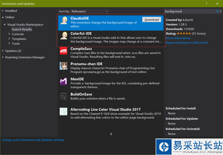 我們打開VS的擴展安裝界面:【工具】->【擴展和更新】->【聯(lián)機】,輸入 “Background”,可以看到有兩個搜索結(jié)果:“ClaudiaIDE”以及“Colorful-IDE”,ClaudiaIDE 它的更新日期為2017.8,而 Colorful-IDE 的更新日期為 2017.1 所以我選擇了 ClaudiaIDE(最近更新原則,瞎扯淡)。