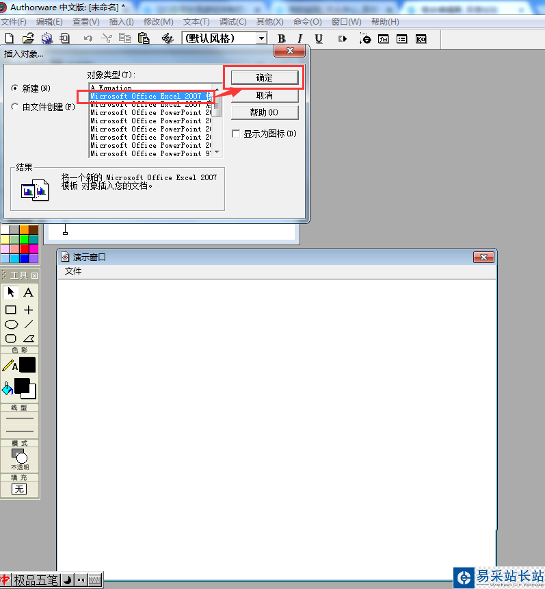 5、在插入對象對話框中,選擇Excel,然后按確定;