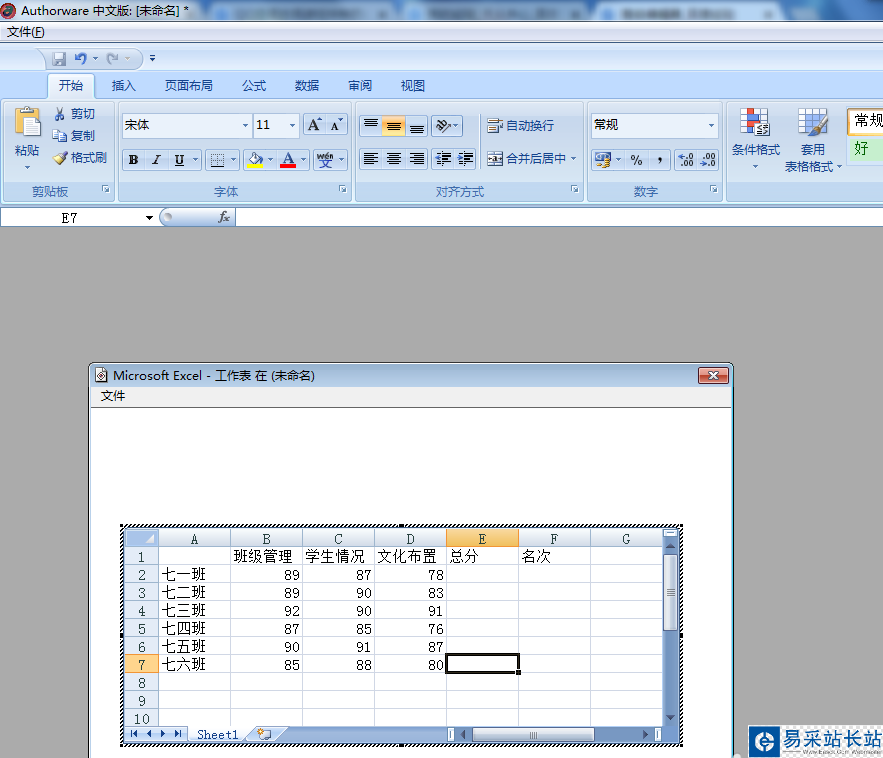 8、在電子表格空白處任意一個地方按一下鼠標左鍵,就可以返回到Authorware的演示窗口,并能看到剛才輸入的表格了,這個表格還有計算功能哦。