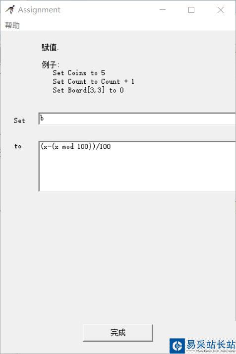 4、在第一個賦值框上方輸入 a 下方輸入 x mod 10,在第二個賦值框上方輸入b 下方輸入 (x-(x mod 100))/100。