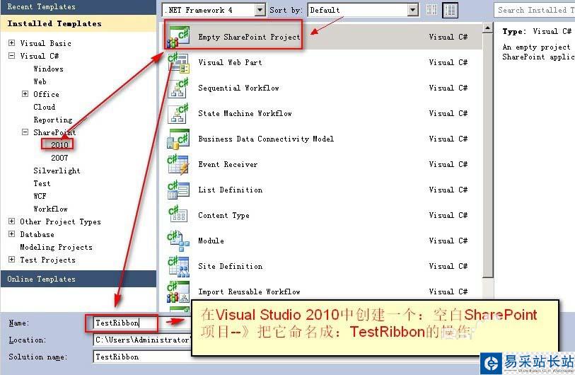 3、在Visual Studio 2010中創(chuàng)建一個:空白SharePoint項目--》把它命名成:TestRibbon的操作