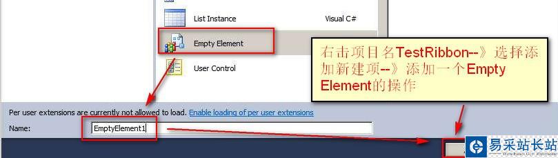 4、右擊項目名TestRibbon--》選擇添加新建項--》添加一個Empty Element的操作