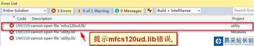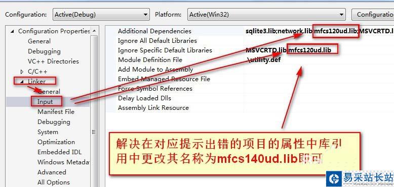2、解決在對應提示出錯的項目的屬性中庫(Properties->Linker->Input->Additional Dependencies)引用中更改其名稱為mfcs140ud.lib即可。