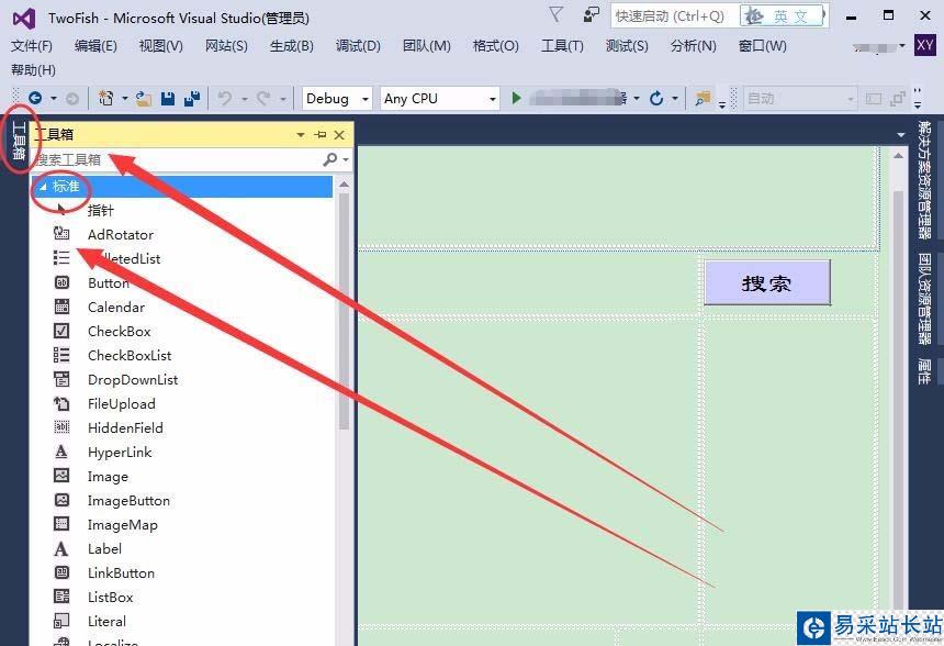 1、打開Visual Studio軟件后,選擇工具箱選項(xiàng),展開標(biāo)準(zhǔn)類型控件。