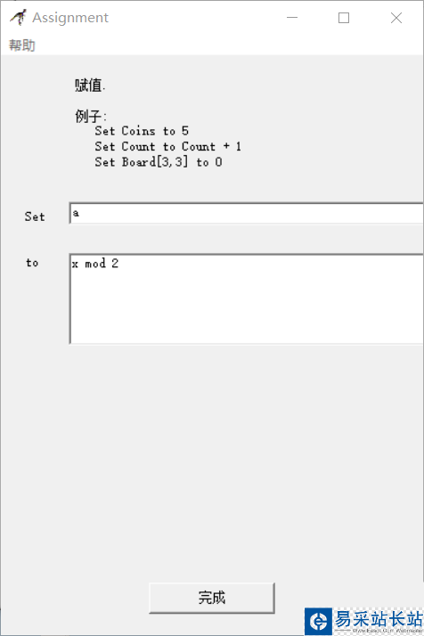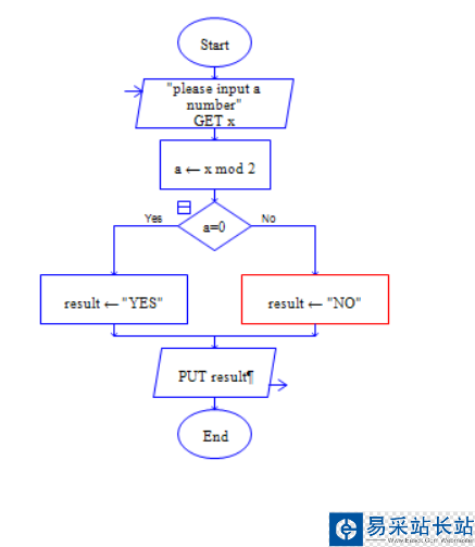 5、雙擊賦值框1 在上方輸入 a 下方輸入x mod 2,雙擊賦值框2 在上方輸入 result 下方輸入 "YES",雙擊賦值框3 在上方輸入 result 下方輸入 "NO"