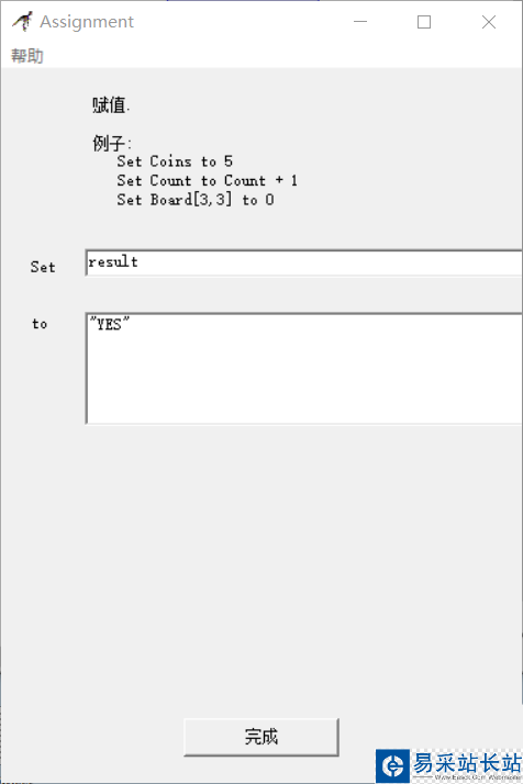 在賦值框1上方輸入 result 下方輸入 "YES"