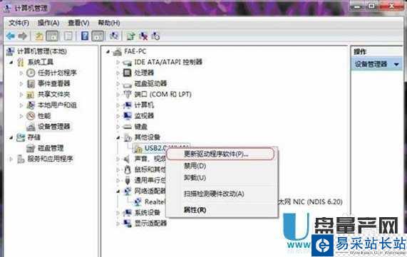 (1)、在出現(xiàn)黃色嘆號(hào)的USB驅(qū)動(dòng)上右鍵點(diǎn)擊,然后選擇“更新驅(qū)動(dòng)程序軟件”,如上圖所示: