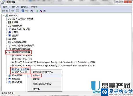 (2)、接著點(diǎn)擊“通用串行總線控制”,找到USB Root Hub依次右擊“USB Root Hub”,選擇“禁用”,接著在右擊選擇“啟用”。如下圖所示: