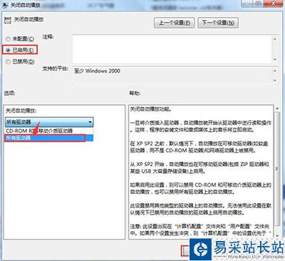 3、在彈出的窗口中,勾選“已啟用”復選鈕,然后在“關閉自動播放”框中單擊“所有驅動器”,點擊應用--確定進行保存,最后關閉“組策略”窗口。