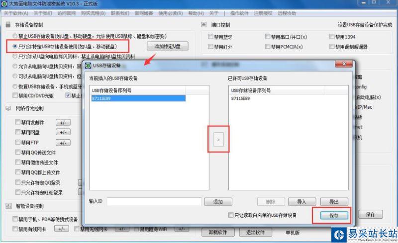 2、只允許特定USB存儲設備,顧名思義就是只允許電腦使用特定的U盤,點擊“添加特定U盤”就可以添加允許使用的U盤了,如下圖所示: