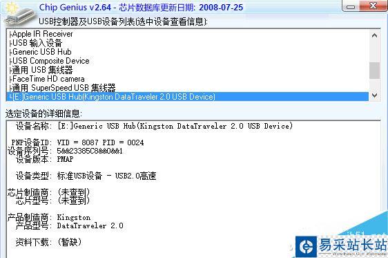 啟動后在彈出的主界面中,選擇“USB設備芯片檢測”按鈕,即可獲得當前U盤的設備信息,其中PID和VID信息,可以幫助我們查找與U盤相匹配的量產工具。