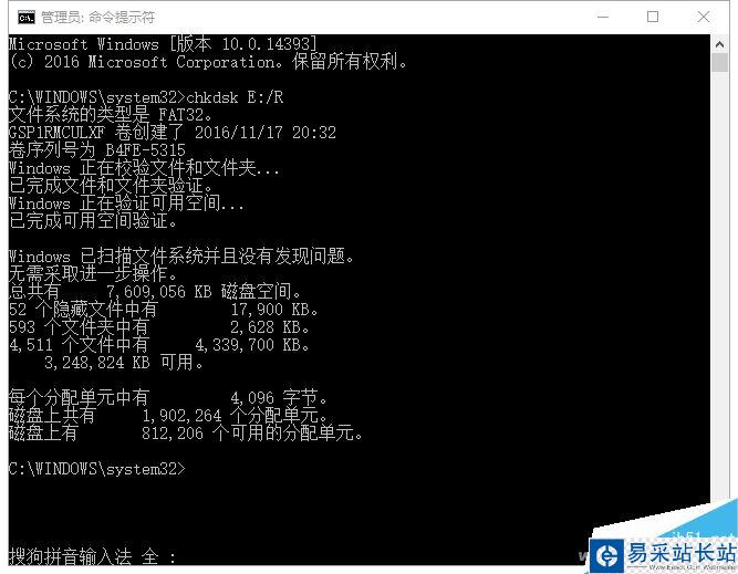 chkdsk U盤盤符/R 回車等待系統運行即可。