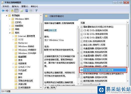 2、在打開的窗口中,依次展開左側的“計算機配置→管理模塊→系統→可移動存儲訪問”,找到并雙擊“所有可移動存儲類:拒絕所有權限”;