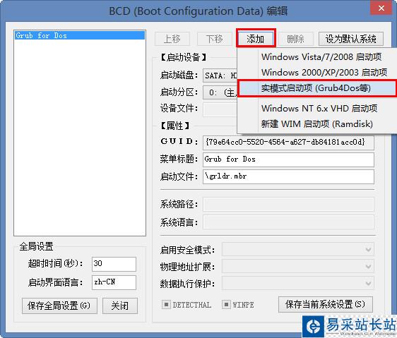 bootmgr是通過BCD文件顯示菜單,因此修改BCD文件即可,本文借助Bootice工具,首先打開BCD文件,可以刪除已存在的菜單,然后添加新的菜單。下圖添加“調用Grub4DOS、EasyBoot”的菜單。