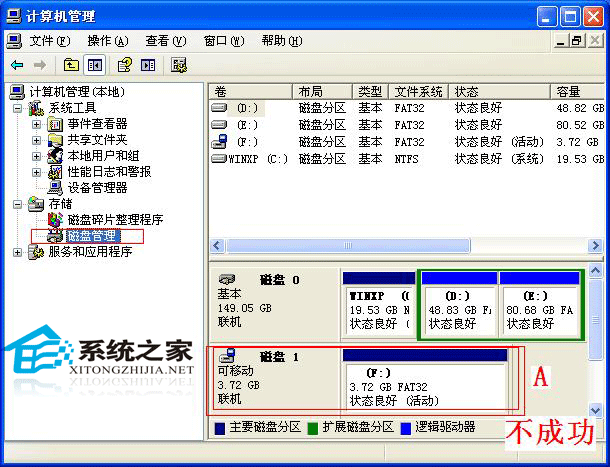 如下面兩幅圖片所標(biāo)“A"處,如果成功為兩個(gè)分區(qū),不成功或者沒(méi)有制作為一個(gè)分區(qū)