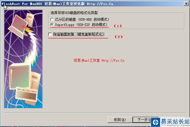 在這一步選擇U盤(pán)的啟動(dòng)模式,大家的都USB-ZIP的啟動(dòng)模式相對(duì)來(lái)說(shuō)兼容性,及穩(wěn)定性都相對(duì)要好,而且啟動(dòng)后就直接是A盤(pán)符,這樣大大的方便了我們制作DOS啟動(dòng)。所以這里我們建議您選擇USB-ZIP模式,如果您要保留U盤(pán)的資料請(qǐng)先選中啟動(dòng)模式如:USB-ZIP,然后再選擇“保留磁盤(pán)數(shù)據(jù)”這樣可以不格式化U盤(pán)而直接制作引導(dǎo)了。