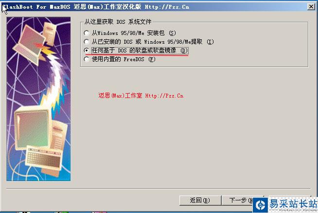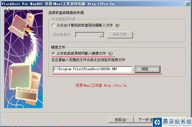 然后在下圖中選擇你的DOS啟動(dòng)盤(pán)的軟盤(pán)鏡像,如果您沒(méi)有,可以選擇FLASHBOOT安裝目錄中的由我們集成的DOS98.IMG鏡像,此鏡像已包含MSDOS 7.1的啟動(dòng)文件。