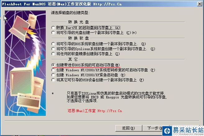 選擇您要通過(guò)哪媒體創(chuàng)建U盤(pán)啟動(dòng),由于我們制作的是DOS啟動(dòng),所以我們選擇“創(chuàng)建帶迷你DOS系統(tǒng)的可啟動(dòng)閃存盤(pán)。