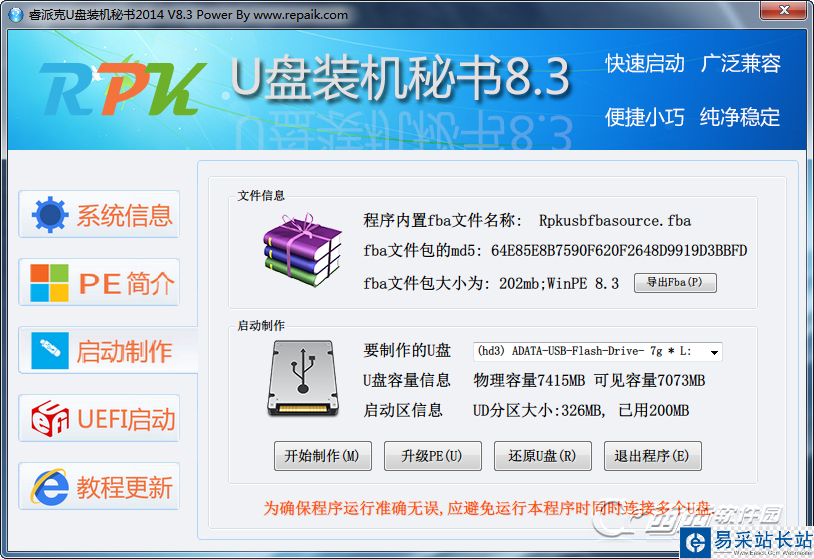 三、啟動制作如上圖所示,啟動秘書切換到啟動制作頁面后,秘書將列出fba文件包的名稱,MD5信息,大小和WinPE版本;在這里,你還可以使用秘書自帶的導出Fba功能將程序內置的Fba文件包導出以供自己DIY/YY之用