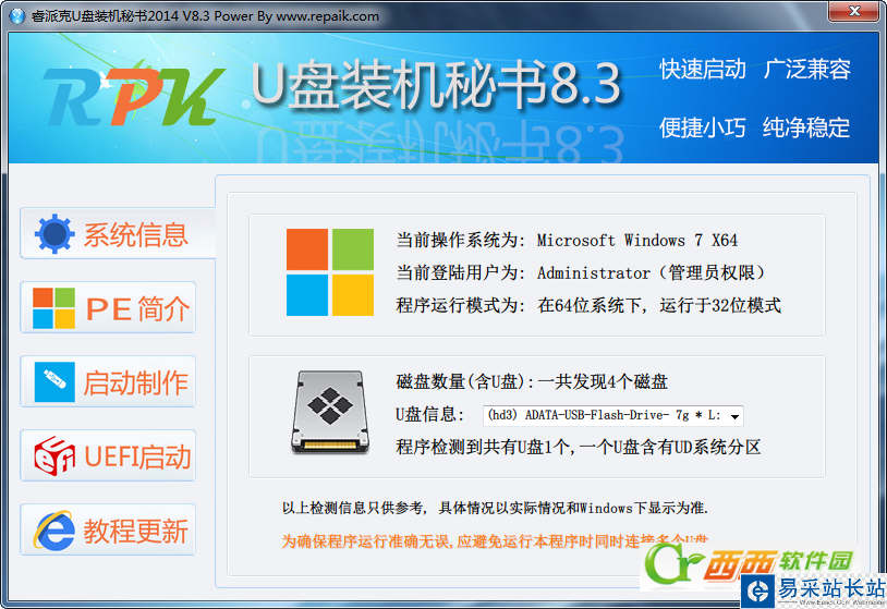 如上圖所示,啟動秘書切換到PE簡介頁面,秘書將Windows PE和U盤裝機秘書的主要特點做了盡可能簡潔的描述;使得新接觸本工具的維護人員有一個最基本的概念。