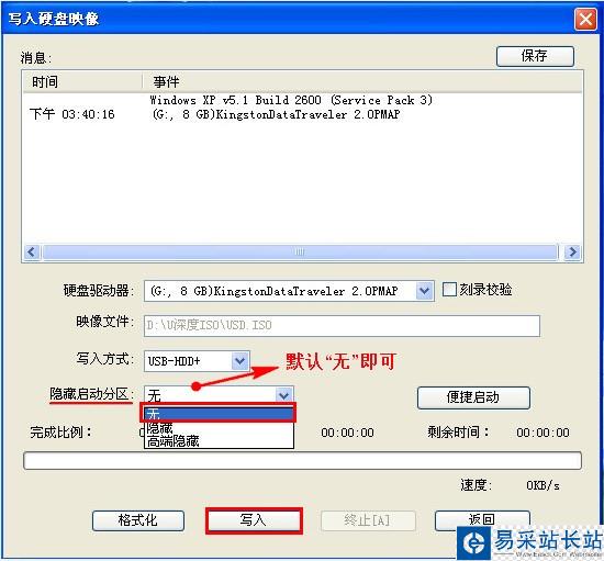 4、彈出的菜單中,我們找到“隱藏啟動(dòng)分區(qū)”這個(gè)選項(xiàng),默認(rèn)設(shè)置為“無”,我們不需要進(jìn)行修改(選項(xiàng)中還有“隱藏”和“高端隱藏”的選項(xiàng),他們的好處就是能將啟動(dòng)文件隱藏,但是兼容性不好,因此我們默認(rèn)選擇不隱藏即可),然后點(diǎn)擊下方的“寫入”,隨后彈出警告窗口,我們選擇“確定”,如圖所示: