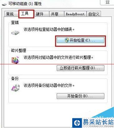 2、在彈出的屬性窗口中點擊“工具”選項卡,再點擊“開始檢查”按鈕,如下圖所示: