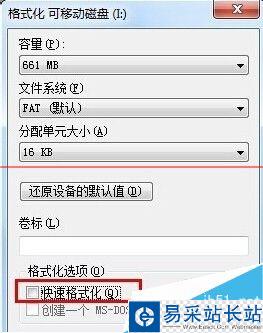 5、在彈出的格式化磁盤窗口中取消勾選“快速格式化”再點擊“開始”按鈕,如下圖所示: