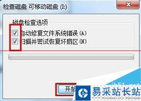 3、接著勾選“自動修復文件系統錯誤”和“掃描并嘗試恢復壞扇區”并點擊“開始”按鈕,如下圖所示: