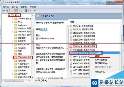 7、在打開的本地組策略編輯器窗口,依次點擊“計算機配置——管理模塊——系統——可移動存儲訪問”并在右側中找到“可移動磁盤:拒絕讀取權限”和“所有可移動磁盤:拒絕讀取權限”單擊右鍵點擊“編輯”選項,如下圖所示: