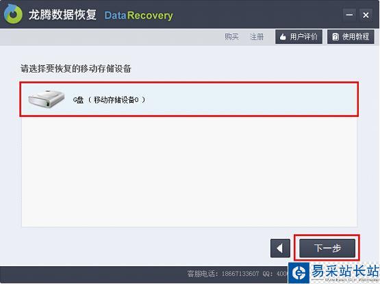 第三步,選擇要恢復(fù)數(shù)據(jù)的U盤,然后點(diǎn)擊下一步。如果軟件沒(méi)有檢測(cè)到U盤,大家則需要重新插好U盤,直到軟件能檢測(cè)到U盤。