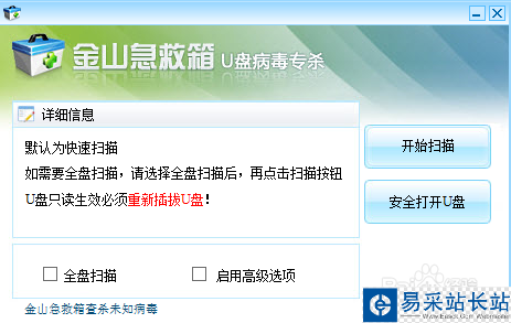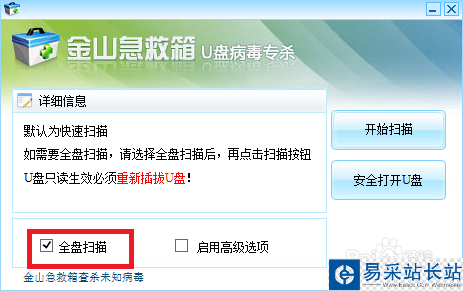 3、打開“金山U盤專殺”,勾選全盤掃描,然后開始掃描。