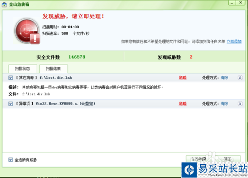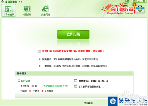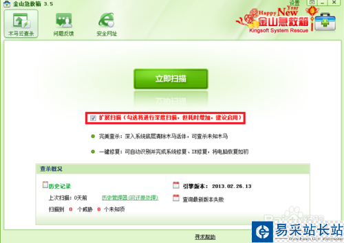 4、打開“金山急救箱”,勾選擴展掃描,然后立即掃描。