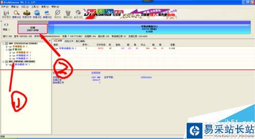 4、然后打開DiskGenius軟件,單擊u盤的那一項。我們看到了1000多MB的空閑空間。